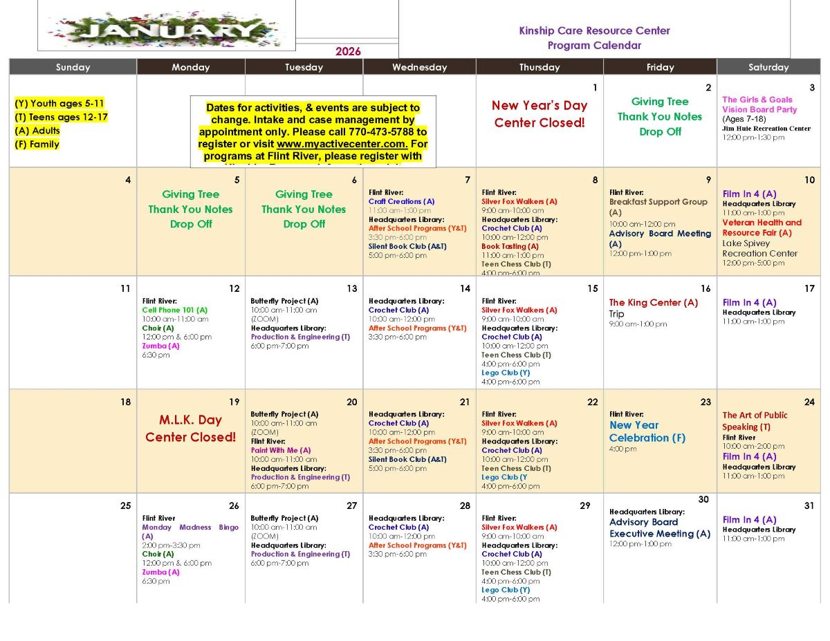 Enrollment for Kinship Care services is open to all Clayton County grandparents raising grandchildren and other relative caregivers in parent-absent homes. Applicant must bring proof of residency, custody/guardianship papers, and social security cards for children in their care. New Client intakes and orientations are done every Wednesday and Thursday by appointment.